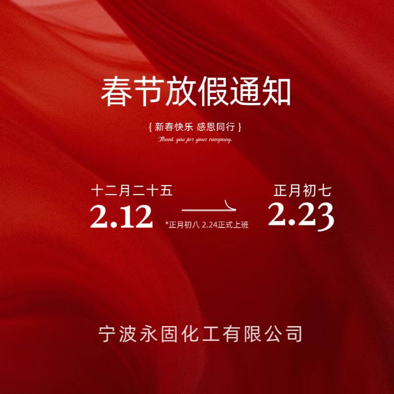值此新春佳节来临之际,宁波永固化工向全体员工、广大客户、合作伙伴及社会各界朋友致以最诚挚的感谢和最美好的祝福!